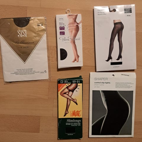 5 pk (4 svarte + 1 light amber ) strømpebukser str L, 40 -44, usikker på str på den ene + 3 stk uåpnet pakker med kne strømper / nylonstrømper