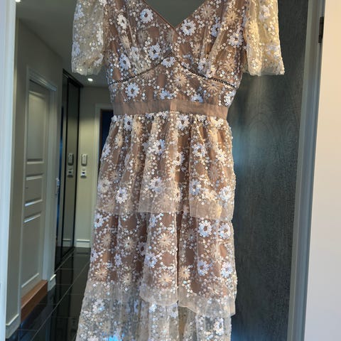 kjole til spesiell anledning for dame i størrelse M passer L . Lang modell i beige farge, laget i polyester. Kjolen har ermeløst liv med v-utringning foran og bak, markert midje med smal beltedetalj og vid, fotsid skjørt. Passer til formelle anledninger som selskap, bryllup eller andre spesielle begivenheter.
