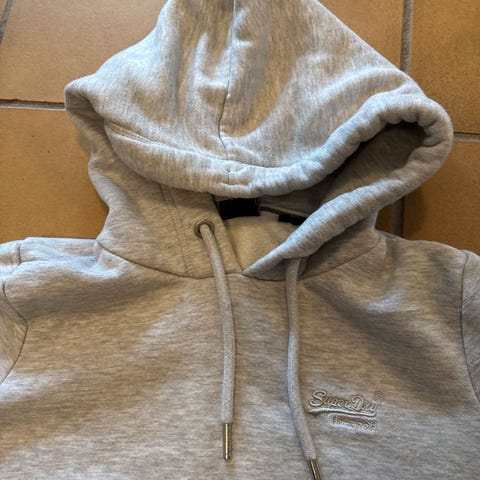 Superdry hettegenser for herre i størrelse 42. Genseren er beige og laget av bomull. Modellen har hette med snøring og stor logo på brystet. Passer til hverdagsbruk og fritid. Har og lomme