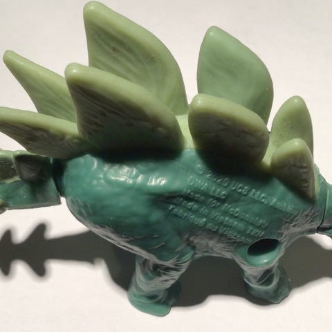 Dinosaur figur leke i grønn plast med gule pigger. Figuren forestiller en fantasidinosaur med kraftig kropp, piggete rygg og hale med store horn. Egnet som lekefigur for barn eller som samlefigur og pynt. Undersiden har støpte detaljer og tallmarkeringer.Figuren er en Megaglyptodon,som er en del av serien Dinofraz Combact.