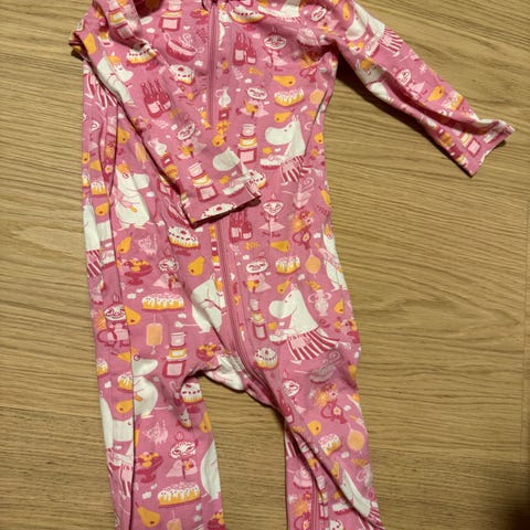 Brun, mørkeblå med lam og grå med Mummitroll er str 62-68.