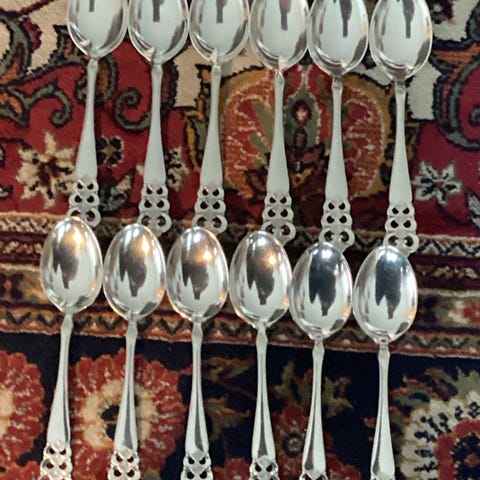 Sett med emaljerte teskjeer i metall i ulike farger. Skjeene har dekorative skaft med farget emalje på forsiden og baksiden. Egner seg som teskjeer til kaffe eller te, eller som samleobjekter og pynt. Antall og eksakte mål fremgår ikke av bildene og bør eventuelt oppgis av selger. 10 stk 925 sølv . De 4 øverste er litt skadet / emalje borte på håndtak