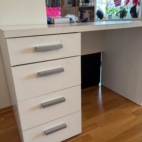 Denne versjonen av skrivebordet der alt er i hvit beis er en utgått variant fra ikea, fåes ikke kjøpt lengre.