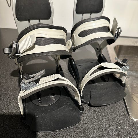 Dette er en Rad Air snowboardstøvel og binding på et snowboard.