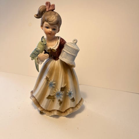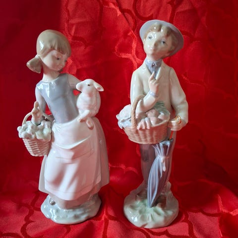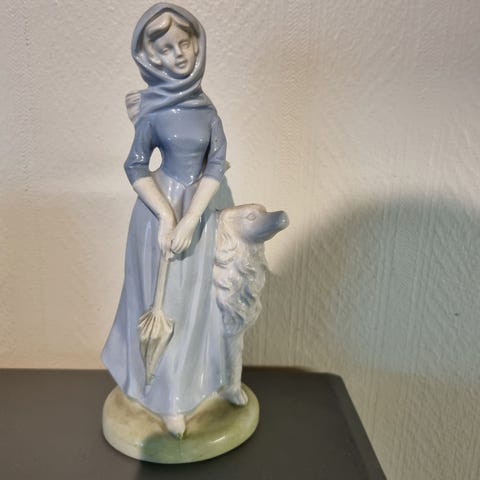 Flott håndlaget porselensfigur fra Nao by Lladro, kjent som “Country Maiden” (modell 0493). Figuren, designet av Regino Torrijos, forestiller en ung jente med hatt i blå overdel og grått skjørt med hvitt forkle, som bærer en vannkrukke – et vakkert eksempel på spansk porselenskunst.