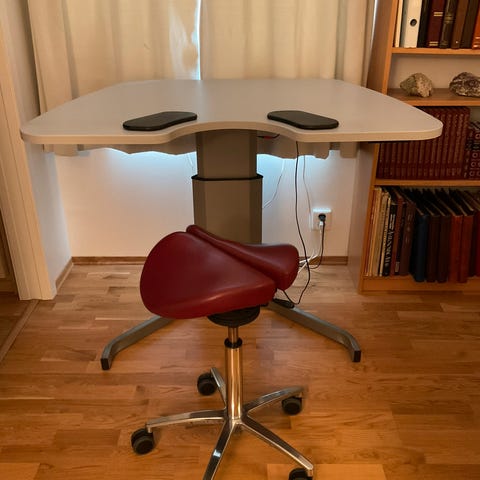Andersson Frame elektrisk hev‑ og senkebord med bordplate i hvit laminert sponplate.