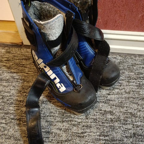 Alpina langrennsstøvler i svart med røde lisser. Sålen er tilpasset moderne langrennsbindinger (NNN-system) med tydelig profilert gummisåle for godt feste ved gange. Størrelse 29.