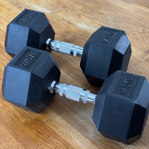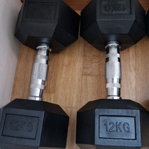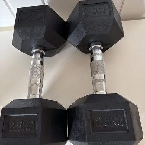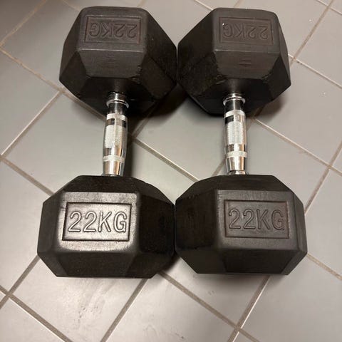 1stk Hantel manual på 60 kg med sekskantede ender i svart gummi og metallgrep. Gummibelegget bidrar til å beskytte gulv og redusere støy ved nedsetting.