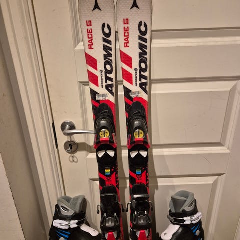 Atomic Race 7 alpinski med integrerte bindinger i rød og hvit farge. Skiene er 90 cm og har justerbare bindinger som kan tilpasses ulike støvelstørrelser. Støvlene er i størrelse 33-34. Kan sende 🤩