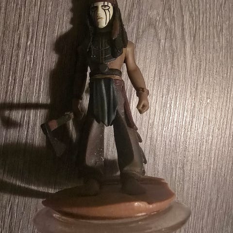 Actionfigur med stav i grønn farge. Figuren har løstsittende bukser, vest og detaljerte folder i klærne. Den holder en lang stav og har bevegelige ledd. Egnet som samleobjekt eller lekefigur.