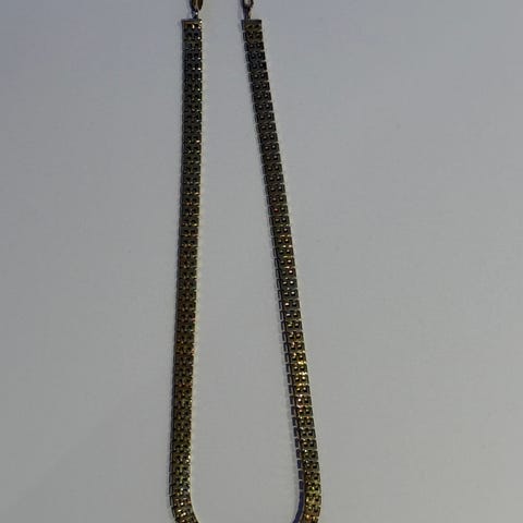 Gullfarget halskjede selges. Det er 90 cm langt.