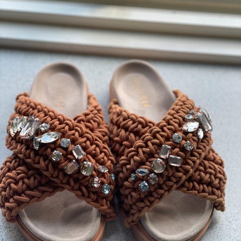 Inuiiki sandaler i størrelse 39. Modellen har brede, krysslagte remmer i svart heklet materiale med dekorative steiner i ulike farger på oversiden. Sålen er formet for foten med lys innersåle og mørk yttersåle med riller. Åpne sandaler som passer til bruk på varme dager eller innendørs der man ønsker en enkel slip-on modell.