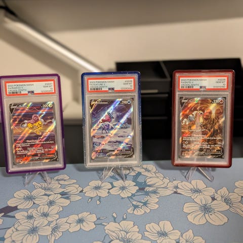 To Pokémon-kort vist i bildene, ett med Mewtwo og ett med Charizard. Kortene ligger i plastlommer. Baksiden viser standard Pokémon-design. Egner seg til samling eller som del av et Pokémon-kortsett.