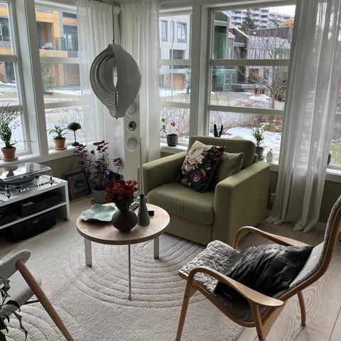 Selger 2 stk. pent brukte lenestoler i lys bjørk fra Hødnebø. Stolene har ingen skader eller bruksmerker i treverk eller sitteputer/polstring.