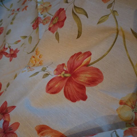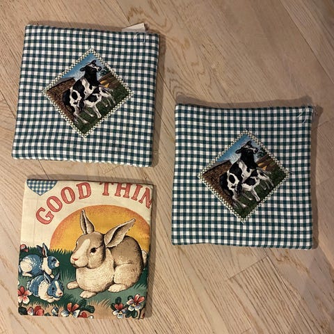 Tre ulike stykker (typ størrelse med en duk eller større) med stoff som gjenstår etter prosjekter. Rosa velur, lyseblå kordfløyel, og beige bomull med stjerneprint.