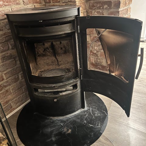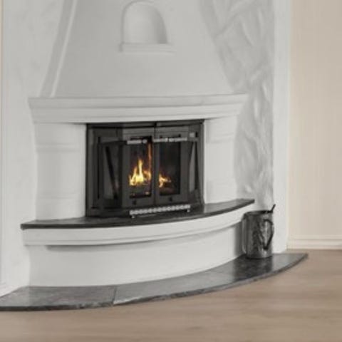 Peisinnsats vedovn med svart front og glassdører. Glassdørene gir innsyn til flammene og kan lukkes under fyring. Egnet som fast ildsted i bolig.