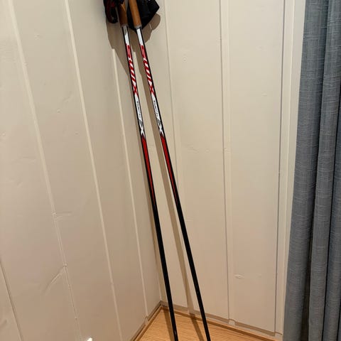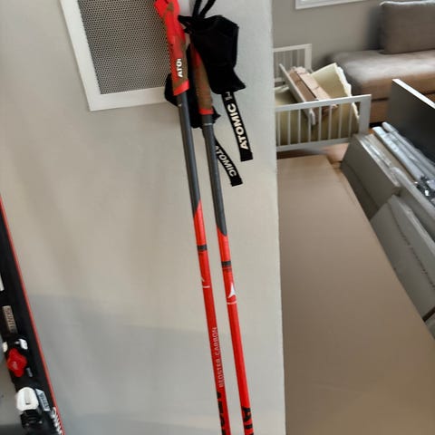 Gode Atomic carbon langrennsstaver i delikate farger. Stavene har håndremmer og pigg med små trinser egnet for preparerte løyper. Passer til bruk til klassisk eller skøyting avhengig av lengde i forhold til bruker. Materiale og eksakt modellbetegnelse er ikke oppgitt.