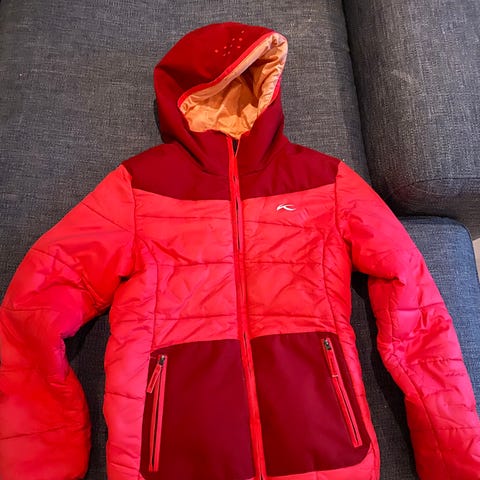 Helly Hansen skidress i to deler: jakke og bukse i størrelse 152. Jakken har hette og hel glidelås foran. Buksen har sidelommer og justering i livet. Fint til alpin eller utelek.