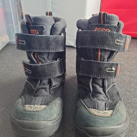 Ecco barnesko støvler i størrelse 27 for unisex. Høye tursko/boots med snøring og kraftig yttersåle med godt mønster. Farge hovedsakelig svart med kontrastdetaljer. Passer til bruk i hverdagen og uteaktiviteter for barn som trenger stabile og robuste sko.