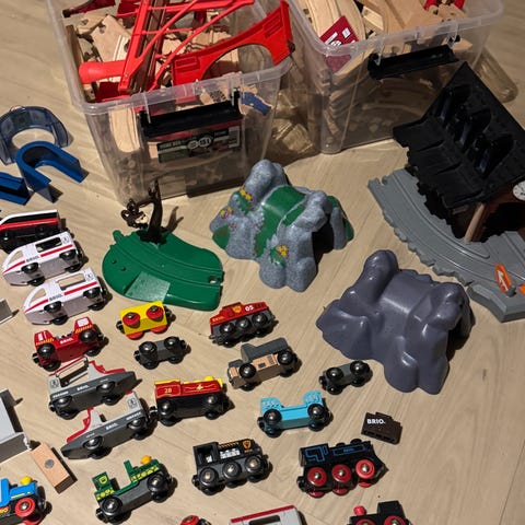 BRIO togbane trelekesett med skinner og kjøretøy. Settet inneholder flere buede og rette treskinner, samt ulike tilbehørsdeler som togstall, bygning, bro og veideler. Det følger med flere tog, vogner og biler i ulike farger, samt noen små dyrefigurer. Delene er laget hovedsakelig i tre med enkelte plastdetaljer. Passer sammen med andre BRIO treskinner og tilbehør i samme system.