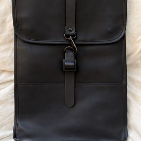 Rains ryggsekk i svart kunstlær for unisex. Sekken har klaff med stroppelukking og spenne foran.