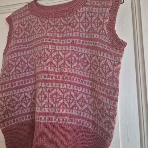 Hjemmestrikket vest i alpakka ull. Strikket med mønsterstrikk hele veien i fargene gammelrosa- naturhvit- okergul- skogsgrønn og falske fletter i alle vrangbordene rundt hals, arm og i nederkant.