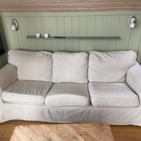 Lys brun semsket skinn sofa til salgs. Putene er fylt med dun. Normal bruksslitasje. Har vært i røyk og dyrefritt hjem. Må hentes