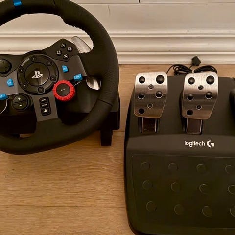 Logitech G29 Driving Force ratt og pedaler til PlayStation. Ratt med innebygde PlayStation-knapper og justeringshjul, kombinert med pedalsett med gass-, brems- og clutchpedal. Utformet for bilspill på PlayStation-konsoller, med bord- eller riggmontering via festeanordninger. Egnet for bruk hjemme til racingspill.
