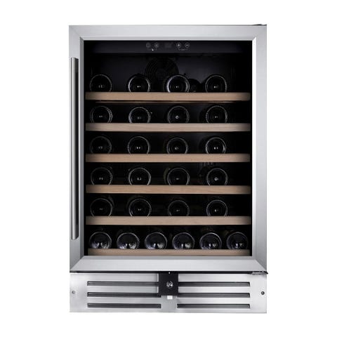 Stort frittstående vinskap selges. Én temperatursone. 5 hyller medfølger, men plass til å sette inn flere. Mangler en bit av det ene benet foran, står dermed litt skjevt, men det er bare å rette opp med en liten plate under skapet. Dette vil ikke være synlig. Har noen tapemerker på siden, disse kan nok fjernes ved god skrubbing med riktig middel.