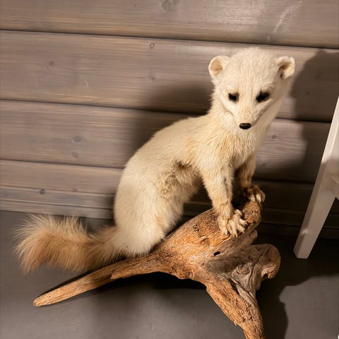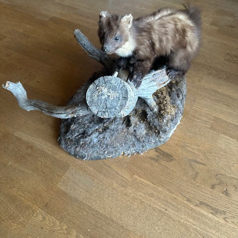 Utstoppet grevling som dekorasjon. Dyret er montert på en trerot og står i naturlig posisjon. Passer som innredningsobjekt, samlergjenstand eller undervisningsrekvisitt. Farger i naturlige brun- og hvittoner. Egnet for plassering på gulv, hylle eller bord, avhengig av ønsket bruk og tilgjengelig plass.
