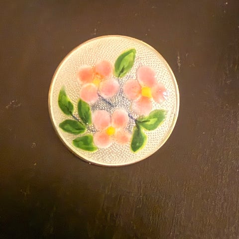 1 Nål i sølv og emalje, 7 cm og stemplet 925S. 1 brosje i tinn m/ eventyrmotiv. Sender mot forskudd og porto. Gi bud