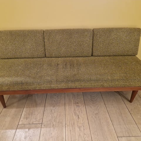 Sovesofa produsert på 60-tallet og designet av Haldor Vik og Ingmar Relling for Ekornes møbler. Sidebordet kan snus og fylles med en av putene når sovesofaen brukes som seng.