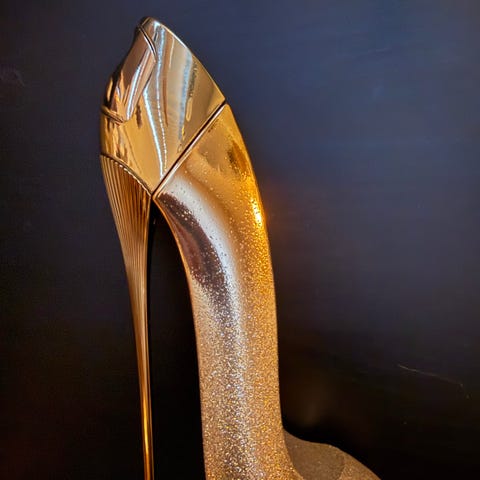 Laurelle Sexxy-Shoo parfyme i skoflaskeform. Flasken er utformet som en høyhælte sko i gullfarget plast/metall-look, med avtagbar hæl som lokk og spraytopp under. Leveres i original eske merket Laurelle London Sexxy-Shoo. Egnet som parfyme til dame og som dekorativ flaske på bad eller sminkebord