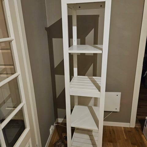 2 hylle reoler. Pent brukt. Den enkle reolen har vært montert på vegg og har en stang montert for kles heng.