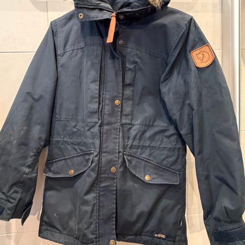 Fjällräven dun vinterjakke for dame i størrelse XS. Jakken er svart og fylt med dun for god isolasjon. Modellen har hette med snøring, gjennomgående glidelås med trykknapper i front og flere lommer foran med klaff og knappelukking. Yttermaterialet er glatt og vattert i brede paneler for jevn fordeling av dunfyllet. Egnet som varm ytterjakke i kaldt vær. Veldig varm og god.