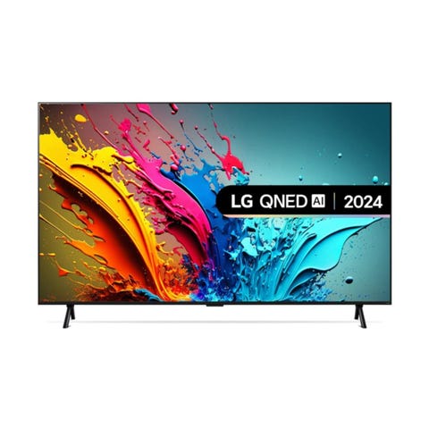 TV-en har en skjermstørrelse på 75 tommer med QD-Mini LED-teknologi og 4K UHD-oppløsning. Bildene viser en veggmontert flatskjerm med tynne rammer, egnet for stue eller hjemmekino. På baksiden er det flere tilkoblingsmuligheter, blant annet HDMI, USB, LAN, optisk lydutgang, kabel- og satellittinngang samt CI-spor. TV-en kan brukes til vanlig TV-titting, strømming og tilkobling av eksterne enheter som spillkonsoller og mediespillere, avhengig av hvilke funksjoner som støttes av den konkrete modellen.
