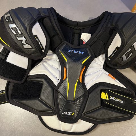 CCM Tacks ishockey albuebeskyttere for barn i svart og gul farge. Modellen har polstret konstruksjon og justerbare borrelåsstropper for å holde beskytterne på plass.