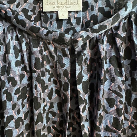 Dea Kudibal bluse for dame i størrelse S. Blusen er flerfarget i syrin/blått/brunt med et mønstret trykk. Materialet er hovedsakelig viskose med noe elastan, som gir et mykt og lett elastisk stoff. Modellen har lange ermer og krage med knappestolpe foran. Passer til bruk både til hverdags og mer formelle anledninger, og kan kombineres med både bukser og skjørt.