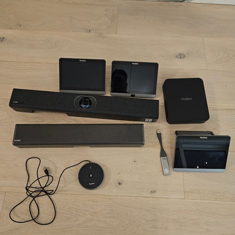 Vi har ryddet på kontoret og selger derfor komplett Yealink møteromsløsning, egnet for Microsoft Teams Rooms eller Zoom Rooms. Utstyret har vært brukt i bedriftsmiljø og fremstår i god teknisk stand. Normal bruk gjennom 3-4 år setter uansett alltids spor.