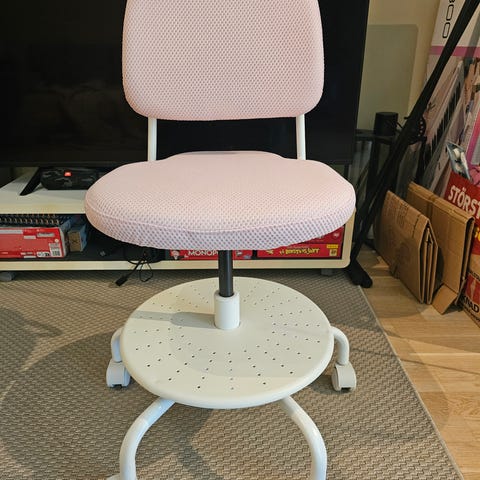 IKEA barnestol med hjul i hvit metallbase og rosa polstret sete og rygg. Stolen har justerbar sittehøyde og dreibart sete. Egnet som stol til barnerom, skrivepult eller lekseplass. Stofftrekket er rosa og viser synlige bruksspor og flekker, som fremgår av bildene.