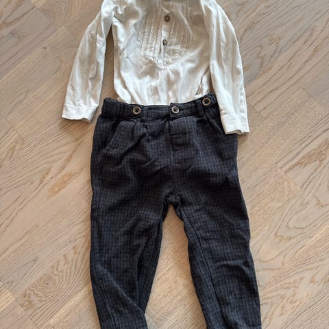 Newbie sett babyklær for gutt i størrelse 80. Settet består av en grønn rutete bodyskjorte med lange ermer og en grønn selebukse, begge i bomull. I tillegg følger det med en strukturstrikket cardigan i lys nøytral farge, også i bomull. Klærne passer til hverdagsbruk og kan kombineres sammen eller hver for seg. Cardiganen er i strl 86, men vil også passe 80.