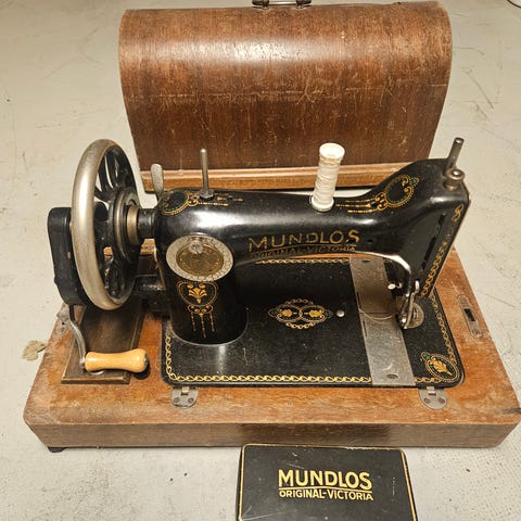 Singer hånddrevet symaskin med dekorativt mønster og trebunn. Maskinen har sveiv på siden for manuell drift og er festet i en treramme med avtagbart lokk. Serienummeret som vises på platen er F988581. Maskinen har metallplate ved nål og transportør, samt klassisk Singer-logo og ornamenter på både arm og front.