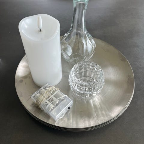 Sølvfarget lysfat i plast.