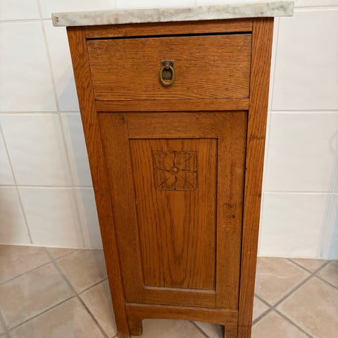 Naturlig patina og bruksspor etter alder gir møbelet mye sjel og karakter. Har ikke vært malt eller modernisert, og fremstår i original utførelse. Skuffene glir lett.
