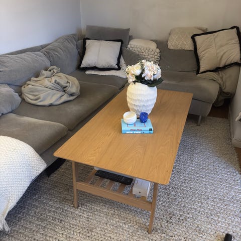 Okayama sofabord i hvitoljet eik selges rimelig. Bordet er pent brukt uten synlige skader eller slitasje. Under bordplaten er det en åpen hylle for oppbevaring av for eksempel fjernkontroller eller blader. Bordet ble kjøpt på Skeidar høsten 2021.