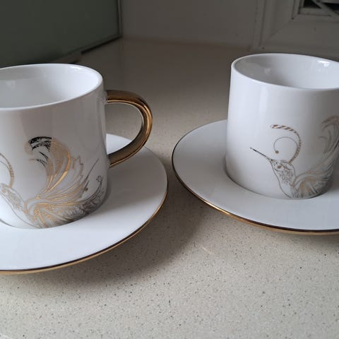 Nydelige gulldekorerte kopper fra Zestlivings med nydelige fuglemotiv inni. 9,5 cm høy. Pris for begge.