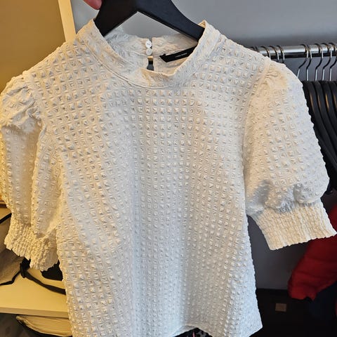 Once Untold bluse for dame i størrelse L. Blusen er hvit og laget av polyester. Den har strukturert mønster i stoffet, lange ermer og rund hals. Lukkes med knapp i nakken. Passer til bruk til hverdags eller mer pyntede anledninger.