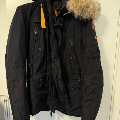 Parajumpers vinterjakke for herre i størrelse XL. Jakken er svart og laget i polyamid. Modellen har hette med pelskant, flere utvendige lommer og karakteristiske Parajumpers-detaljer som merkelapp på ermet og gul stropp ved kragen. Passer som varm ytterjakke i vinterhalvåret.