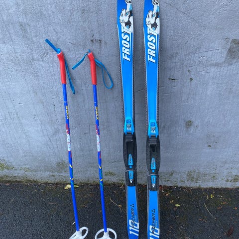 Rossignol Frost barneski i fargene hvit, lilla og rosa. Ski med integrerte Rottefella-bindinger.