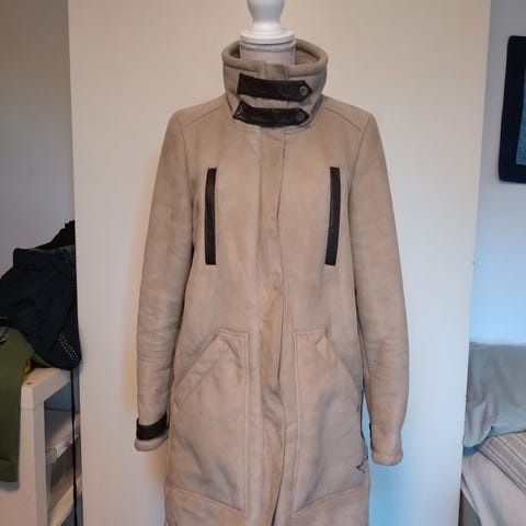 Fin kåpe fra HM, str 36. Innsiden har mykt, teddy-lignende fôr, forholdvis varm og god. Rekker til ca midt på låret.